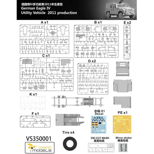 This Vespid Models kit allows you to build a static model of the Eagle IV vehicle in 1/35 scale. The model consists of precisely moulded plastic parts, including clear parts, and a decal sheet for recreating authentic markings.
