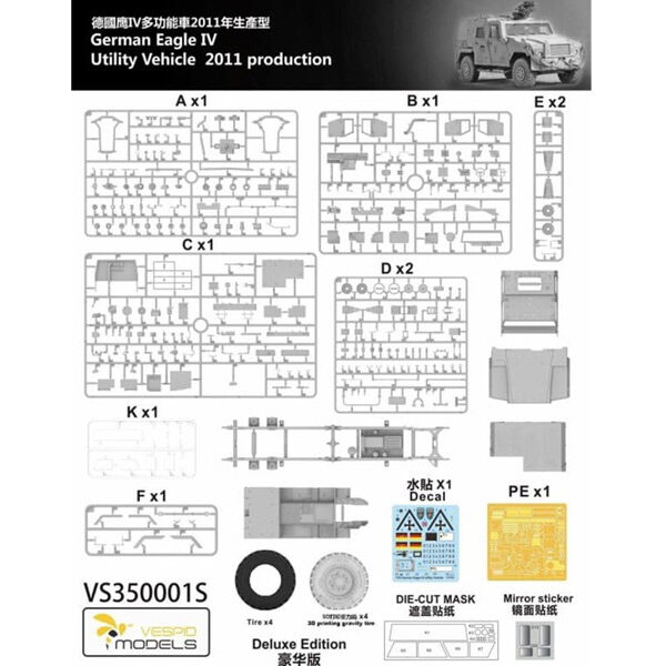 This Vespid Models kit allows you to build a static model of the Eagle IV vehicle in 1/35 scale. The model consists of precisely moulded plastic parts, including clear parts, and a decal sheet for recreating authentic markings.