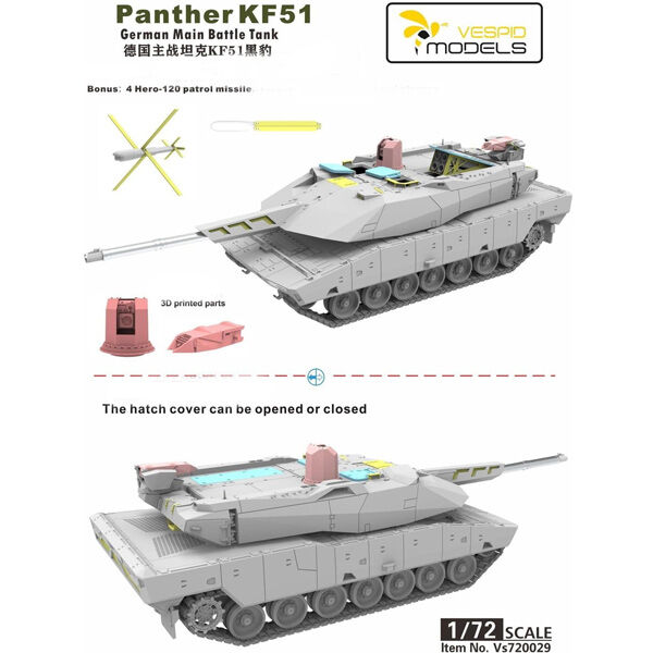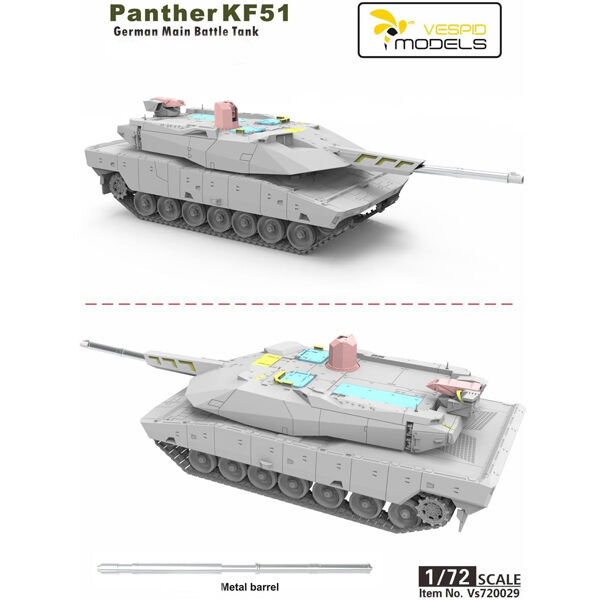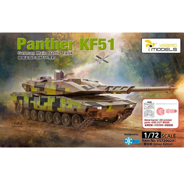 Build your own 1/72 scale Panther KF51 German main battle tank with this comprehensive Vespid Models kit. Featuring a realistic metal barrel, precision 3D printed components, and a convenient die cut mask for detailed painting, you'll have everything needed to create an authentic military model.
