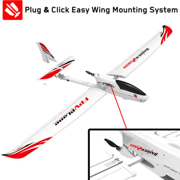 The Ranger 2000 is easy to assemble. Fitted with two spars to strengthen the wings, they are attached using fast connecting wing clips to join the wings into the fuselage. After flying, simply squeeze the clips to release the wings and easily store the plane. The fuselage has the capacity for an FPV camera and related components.