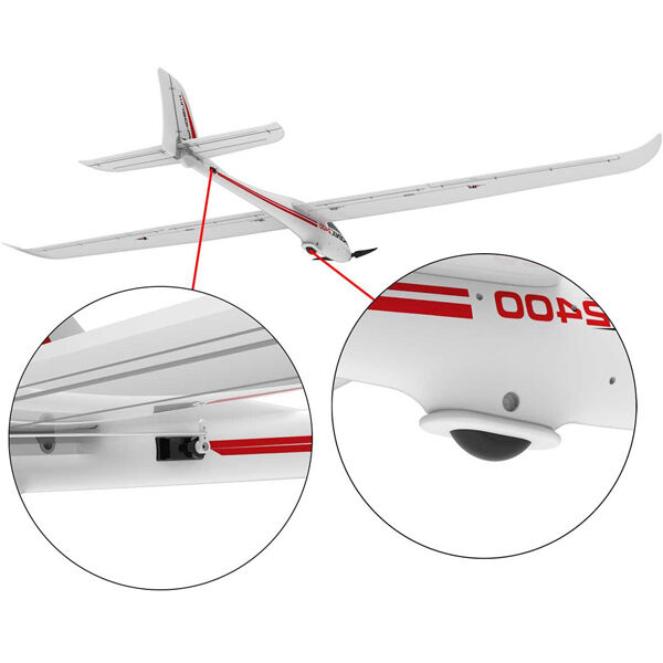 Assembling the glider is quite easy with no glue required. The wing halves simply snap into place along with a rigid wing spar for added strength. The main wing is 2400 millimeters long and contains ailerons and flaps for better aircraft control. The fuselage has a built in single wheel for easier landing on rougher runways.