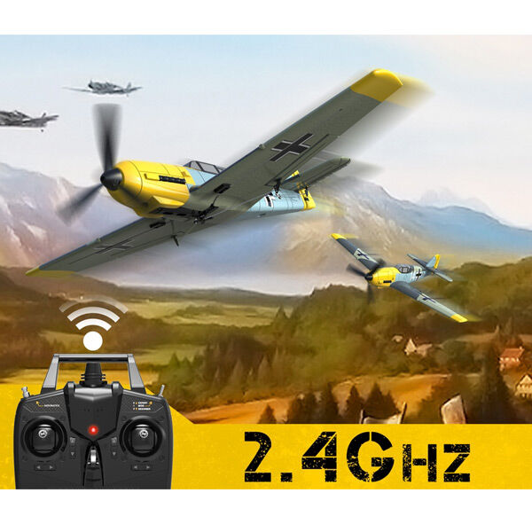 The Volantex RC BF 109 comes with a 4 channel 2.4 GHz controller. The high frequency provides a stable connection without interference from other radio controlled models. Perfect when you want to fly with friends. The controller uses 4 AA batteries (not included).