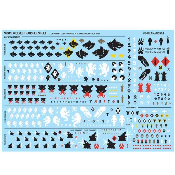 This kit is supplied with 1x Space Wolves Transfer Sheet, containing 419 high quality waterslide transfers. These include symbols for the Blackmanes, the Champions of Fenris, the Bloodmaws, the Spirit Wolves, and the Deathwolves Great Companies, along with vehicle and saga markings.
