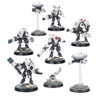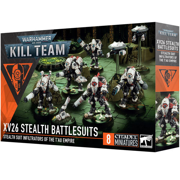 This multipart plastic kit builds eight XV26 Stealth Battlesuits operatives. These miniatures can be used as chameleonic XV26 Stealth Battlesuits warriors in games of Kill Team, or fielded in a T'au Empire army in games of Warhammer 40,000. The kit includes options, accessories, and different heads to customise your kill team, plus components to build specialists like the signal jamming Neutraliser, camouflaged Infiltrator, maverick Lodestar, and more.