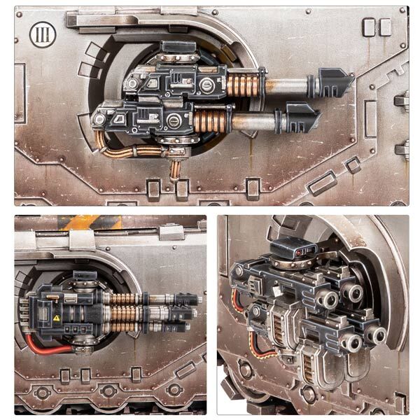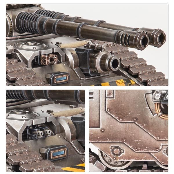 The sponson mounts carry deadly lascannon arrays, which can be replaced with laser destroyers for increased armour busting capabilities, or Gravis heavy bolter batteries to mow down enemy infantry. The kit also includes components to upgrade the Fellblade with a pintle mounted weapon – a havoc launcher, heavy bolter, heavy flamer, multi melta, combi bolter, combi flamer, combi melta, combi plasma, or combi volkite – as well as a searchlight, a hunter killer missile, and cosmetic options such as a choice of gunner, commander, or closed hatch.