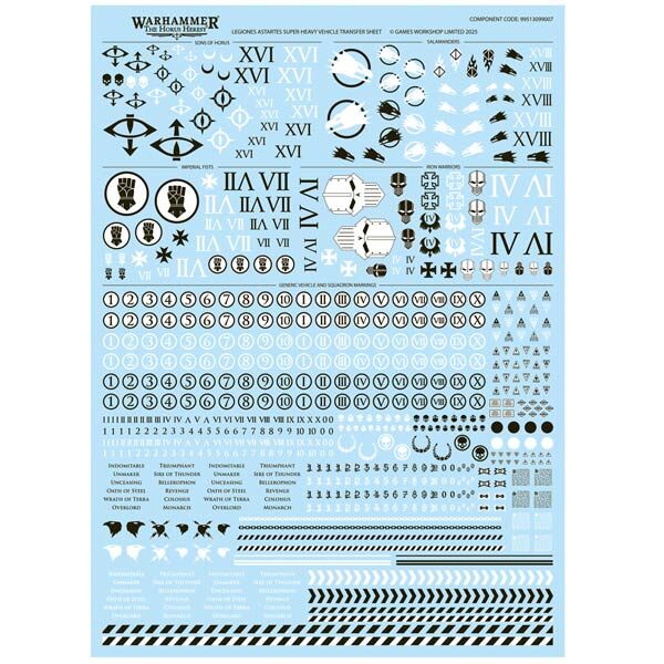 This kit is supplied with 1x Legiones Astartes Super Heavy Vehicle Transfer Sheet, containing 718 high quality waterslide transfers to decorate your miniatures. There is Legion iconography for the Sons of Horus, Imperial Fists, Iron Warriors, and Salamanders, along with generic vehicle and squadron markings, numerals, laurel wreaths, and hazard stripes.