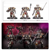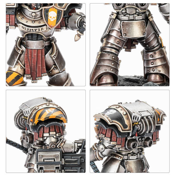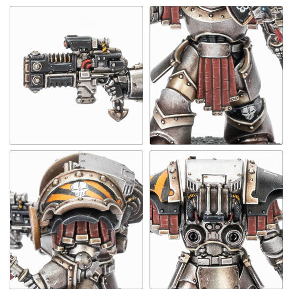 One of the miniatures can be built as an optional sergeant, armed with a choice of power sword, power axe, or thunder hammer, and equipped with one of three shoulder crests or an optional grenade harness. One Terminator can replace their volkite charger with a reaper autocannon. Each miniature has a choice of shoulder pads, matching thigh armour, and optional tilting plates, making it easy to customise your warriors.
