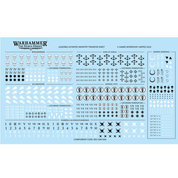 This kit is supplied with 1x Legiones Astartes Infantry Transfer Sheet, containing 618 high quality waterslide transfers. These include symbols for the Iron Warriors, Sons of Horus, Salamanders, and Imperial Fists, along with numerals, honour markings, generic markings, script, and command icons.