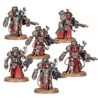 This multipart plastic kit builds six Myrmidon Destructors, elite heavy infantry for your Mechanicum armies in games of Warhammer: The Horus Heresy. They can be equipped with armour busting darkfire cannons or infantry melting irradiation engines. When the fighting gets close, they employ their shock chargers to crush their foes. This durable unit is a great way to provide ranged support as it advances alongside the rest of your army. Each Myrmidon Destructor has a choice of two heads – hooded or unhooded – and there are six servo skulls, which are interchangeable across the miniatures.