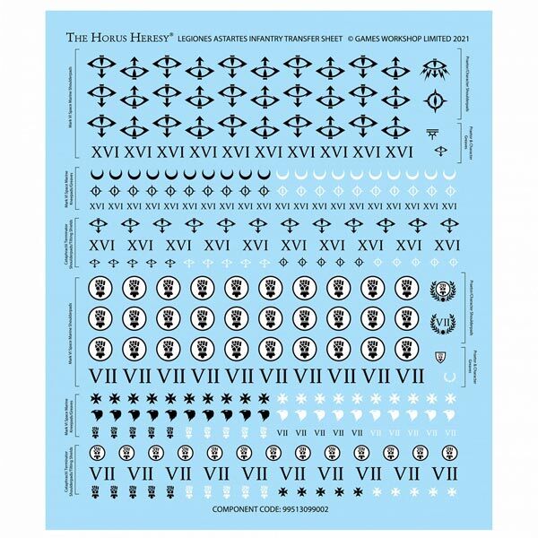 These models have no Legion markings, allowing Warhammer hobbyists to paint them in whichever colours they choose. However, the box includes a transfer sheet with 293 optional markings and iconography for the Sons of Horus and Imperial Fists Legions.