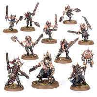 This multipart plastic kit builds 10 Jakhals – human cultists sworn to the service of the World Eaters. Each model is equipped with paired chainblades and a holstered autopistol, and carries a container of sinister chemicals on their back. One of these warriors is a hulking Dishonoured, bigger and more powerful than their comrades, who can instead be armed with a spiked skullsmasher mace. The kit includes components to arm one Jakhal with a two handed mauler chainblade, equip another with a skull strung Jakhal icon, and build a Jakhal Pack Leader with a grisly trophy rack. You'll also find loads of cosmetic build options for both Jakhals and Dishonoured, including a variety of interchangeable heads, weapons, and arms to mix things up across your whole army.