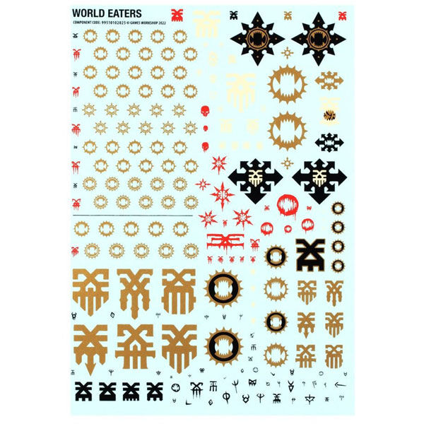 This kit comprises 96 plastic components, and is supplied with a Citadel 40mm Round Base and 10x Citadel 28.5mm Round Bases. Also included is a World Eaters Transfer Sheet, with 200 transfers featuring Khornate symbols, runic tattoos, eight-pointed stars, skulls, and variations on the World Eaters Legion icon.