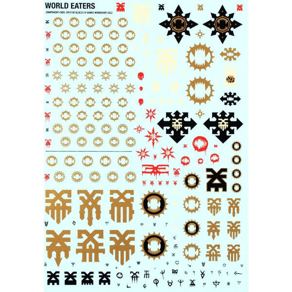 This kit comprises 88 plastic components – a truly auspicious number – and is supplied with 3x Citadel 40mm Round Bases. Also included is a World Eaters Transfer Sheet, with 200 transfers featuring Khornate symbols, runic tattoos, eight pointed stars, skulls, and variations on the World Eaters Legion icon.