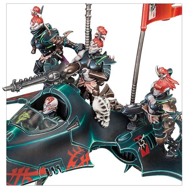 The Venom transport can swap its twin splinter rifle for an additional splinter cannon. It also has two different canopies for the pilot, optional trophy racks and chainsnares, and a choice of three different banner poles. Three optional Wych riders can be added to the Venom – one firing the splinter cannon, and two others holding on.