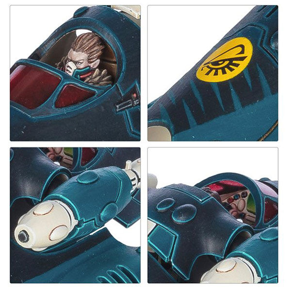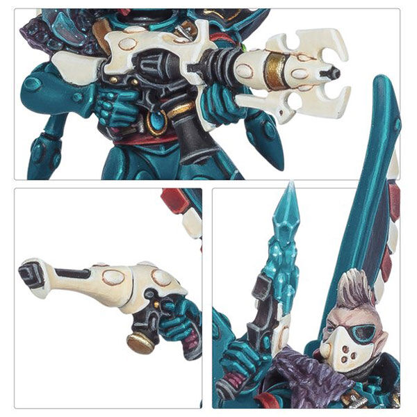 Up to two Corsair Skyreavers can be built as optional champions, each armed with a shuriken pistol, fusion pistol, neuro disruptor, or raiding hook in one hand, and a sword or chainsword in the other. Four miniatures can be armed with optional ranged weapons – a shredder, blaster, fusion gun, or flamer. There are also 30 interchangeable heads (of 15 designs) and 10 interchangeable winged backpacks (of 5 designs).