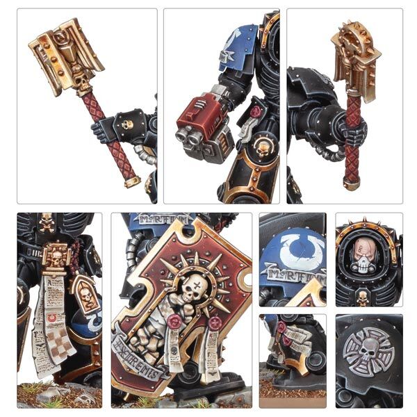 The Chaplain in Terminator Armour is armed with a crozius arcanum in his right hand. In his other hand, he carries either a shell spitting storm bolter or a massive bone bedecked relic shield, offering him further protection in battle. The kit also offers the choice of a helmet or a bare head with rebreather, and two different heads for the crozius arcanum.