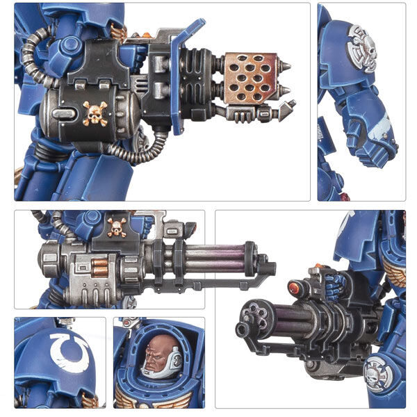 The Terminator Squad members are each armed with storm bolters and either power fists or chainfists. One can alternatively take a heavy flamer, assault cannon, or cyclone missile launcher, and there are parts to build an optional Sergeant.