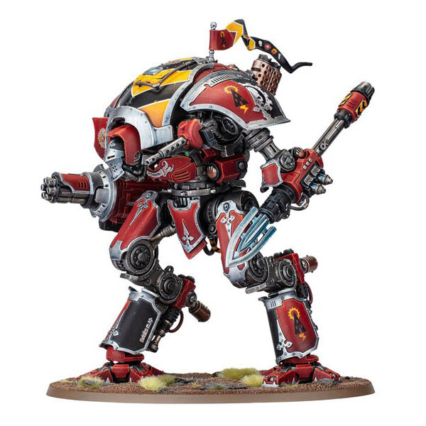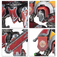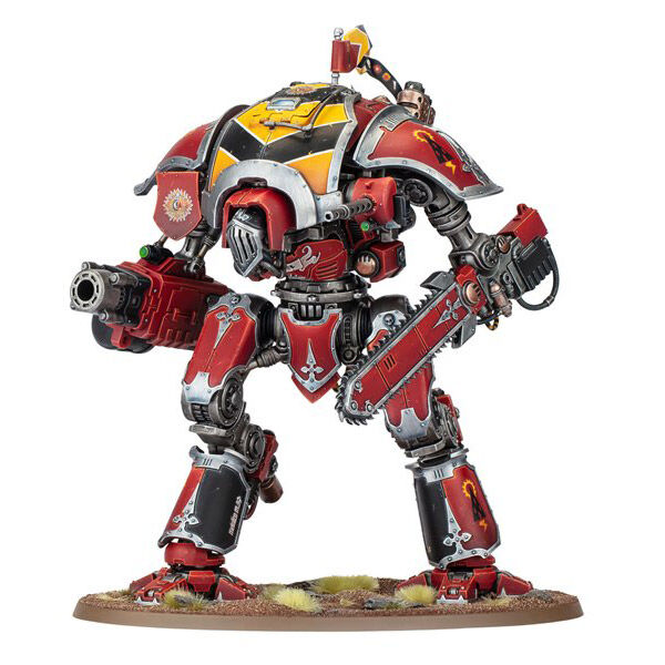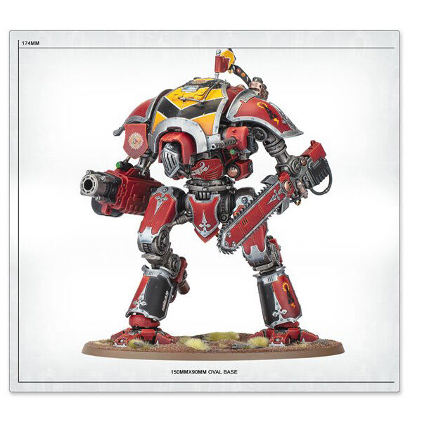 The Knight Destrier is agile and fleet footed. Employing rocket thrusters, skilled pilots are able to lend greater speed to their charge, tearing into the foe with thundershock spears or reaper chainswords before mowing down what remains of their enemies with hails of chastiser gatling rounds or explosive munitions from their frag bombards.