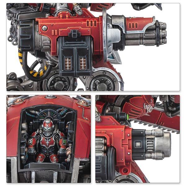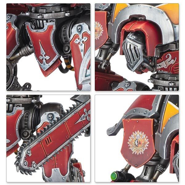 There are 2 straightforward poses for the legs, and an advanced option for more experienced Warhammer hobbyists. The kit includes 3 different face masks, and the hatch can be built closed or open, showing off the detailed interior and pilot. It can be armed with either a multi barrelled heavy calibre chastiser gatling cannon to sweep aside infantry, or an explosive shell firing frag bombard. To accompany this is an oversized rocket assisted thundershock spear to punch clean through reinforced armour, or a versatile reaper chainsword to scythe through hordes or gut monstrous creatures with a single blow. These weapons can be mounted on either arm, making it easy to customise your devastating war machine, and the thundershock spear has 2 assembly options.