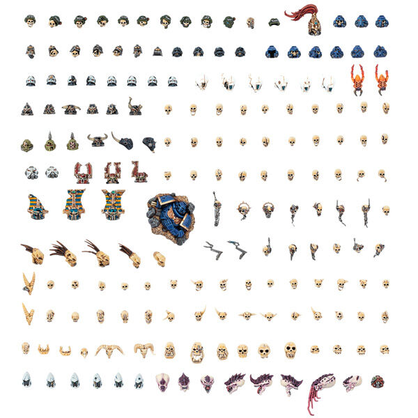 Customise your miniatures with the contents of this morbid kit, featuring a huge variety of components that can be added to bases or used as narrative elements. This collection includes skulls – human, alien, and other – as well as severed heads, some still wearing the helmets of their previous owner. Also included are other grim tokens such as parts of servo skulls, and an – almost – complete fallen Space Marine.