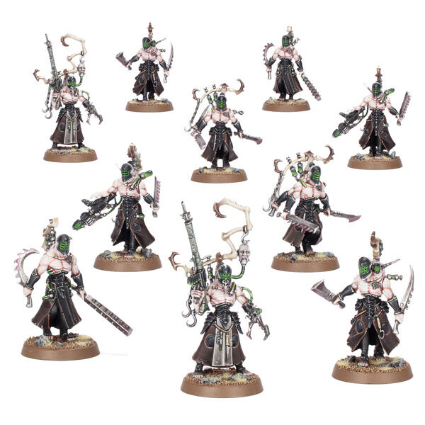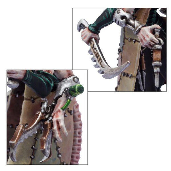 The Wracks can be equipped with a host of interchangeable weapons and equipment, including torturer's tools, two liquifier guns, two ossefactors, two hexrifles, two stinger pistols, masks, and backpacks. There are also parts to build an Acothyst who can additionally be armed with an agoniser, power weapon, or scissorhand.