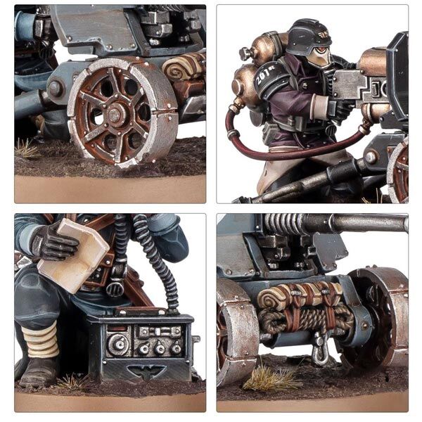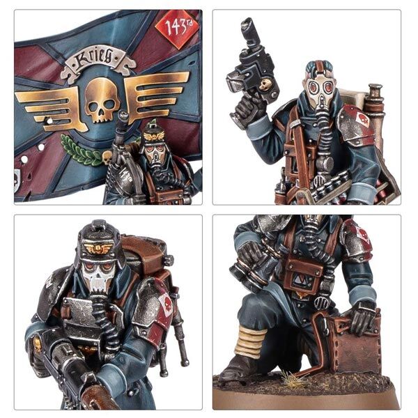 The Heavy Weapons Squad gunners can be armed with a lascannon, a Krieg heavy flamer, or a twin Krieg heavy stubber, along with interchangeable backpacks and accessories. The Fire Coordinator can be built either leaning on their knee or consulting a map of the battlefield.
