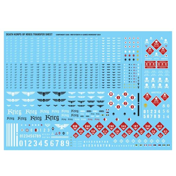 This kit comprises 803 plastic components, 1x Citadel 32mm Round Base, 17x Citadel 25mm Round Bases, 5x Citadel 60mm by 35.5mm Oval Bases, 3x Citadel 50mm Round Bases, and 1x Death Korps of Krieg Transfer Sheet containing 803 high quality waterslide transfers to decorate your miniatures.