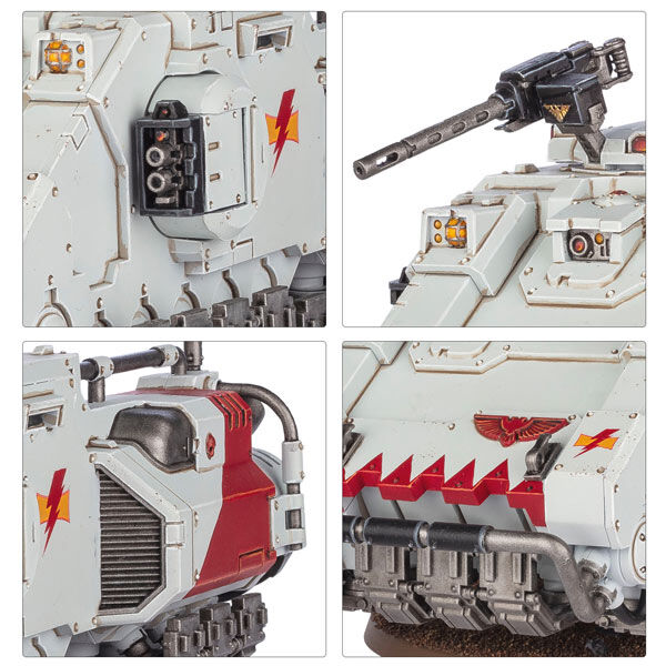 The Impulsor can replace its storm bolters with fragstorm grenade launchers, and can optionally take an ironhail heavy stubber. There are also options for a bellicatus missile array, ironhail skytalon array, orbital comms array, or shield dome.