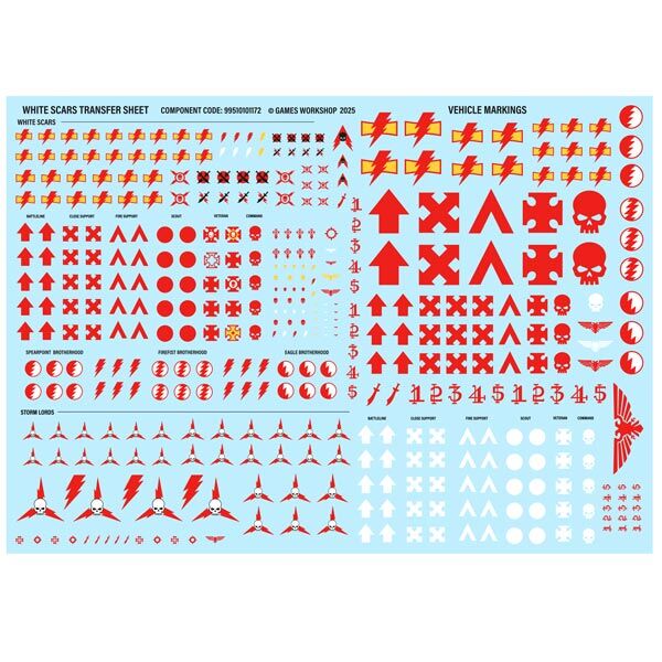 This kit is supplied with a brand new White Scars Transfer Sheet, containing 407 high quality waterslide transfers. These include Chapter icons for the White Scars, battlefield role icons, and numbers. They also include iconography for the Spearpoint Brotherhood, Firefist Brotherhood, and Eagle Brotherhood companies as well as the Storm Lords successor Chapter.