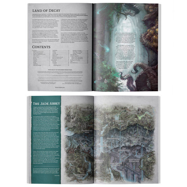 Evil is festering amid the ruins of the Jade Abbey. The daemonic warlord Gelgus Pust seeks to poison the wondrous fount of life giving water known as the Everspring, which lies beneath the ruined stronghold. Magically imbued with restorative properties, the Everspring grants vitality to the surrounding lands. Yet Pust would see it befouled with the toxic gifts of his master – Nurgle, Lord of Plagues. Only an ill matched band of heroes and sellswords stands between the Prince of Sores and his final victory. To reach him, they must navigate a landscape that has been moulded and twisted according to Nurgle’s vile whims.